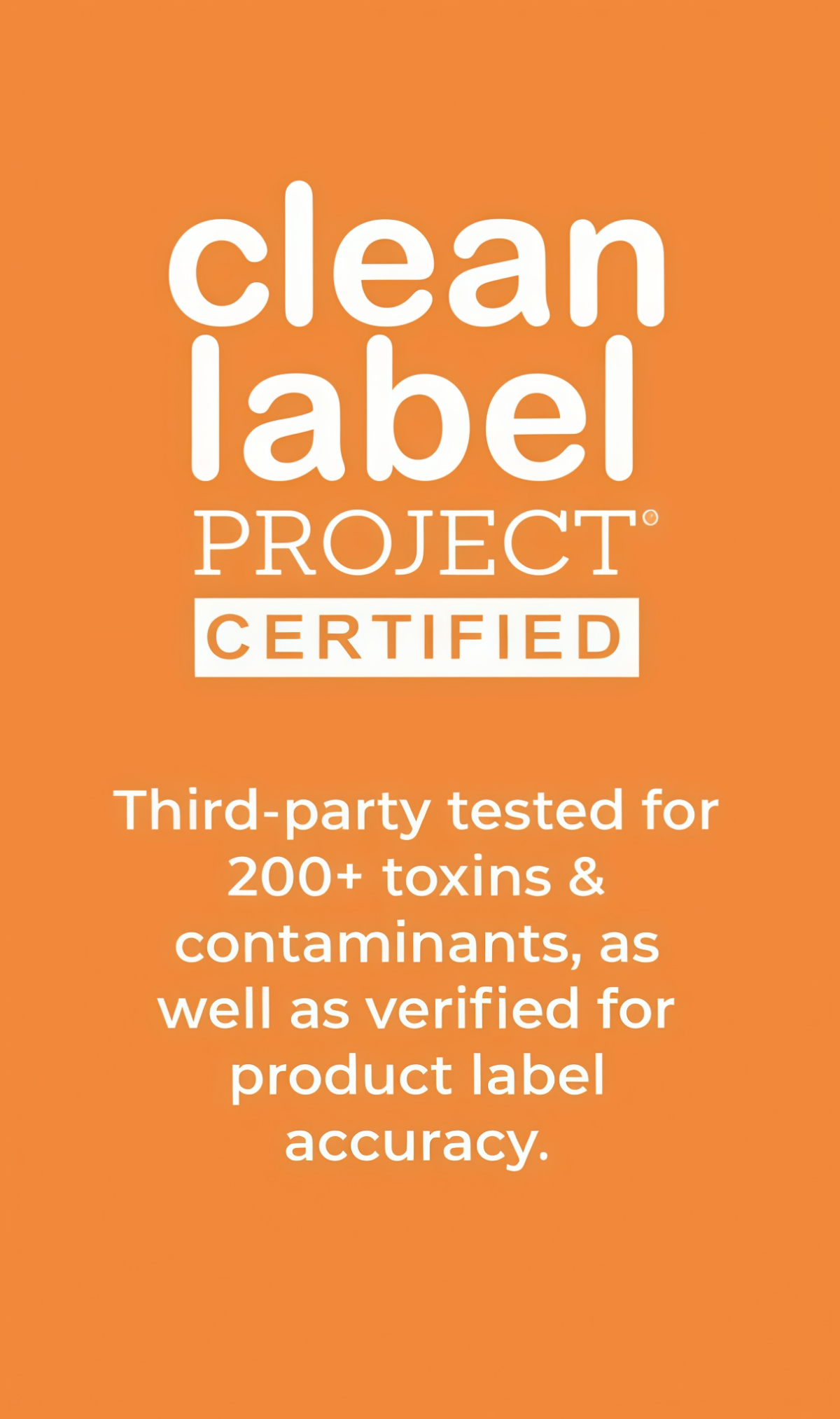 Our products meet top social and environmental standards as a Certified B Corporation. Clean Label Project certified with third-party testing for 200+ toxins, and made in FDA-approved GMP facilities for reliable quality and safety.